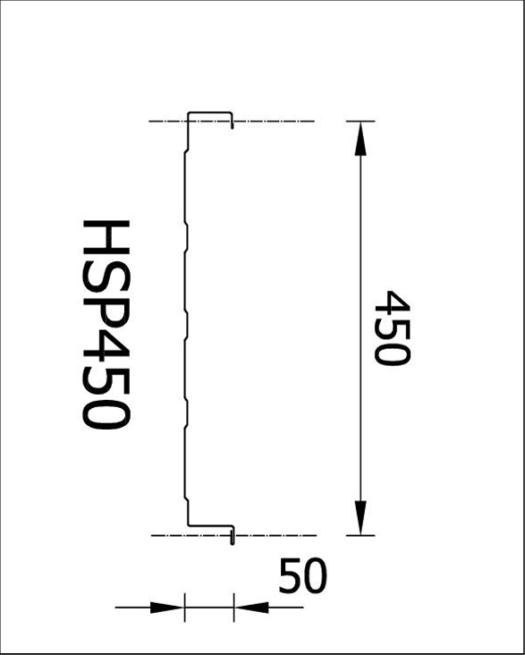 A HungaroSpan HSP450 épületburkolatot a HSU300 és HSV500 ívprofilhoz hasonlóan hideg görgőzéssel alakítjuk ki. Az elemi panelek szélessége 300 mm és 900 mm között választható a gyártógép átállításával, de legáltalánosabban a 600 mm-es kiterített lemezből hengerelt, 450 mm széles profilt alkalmazzuk teljes körű tervező és kivitelező munkánk során. Ezen panelszélességre vonatkoznak a vizsgálatok és tanúsítások is. Az elemek korcmagassága 50 mm.